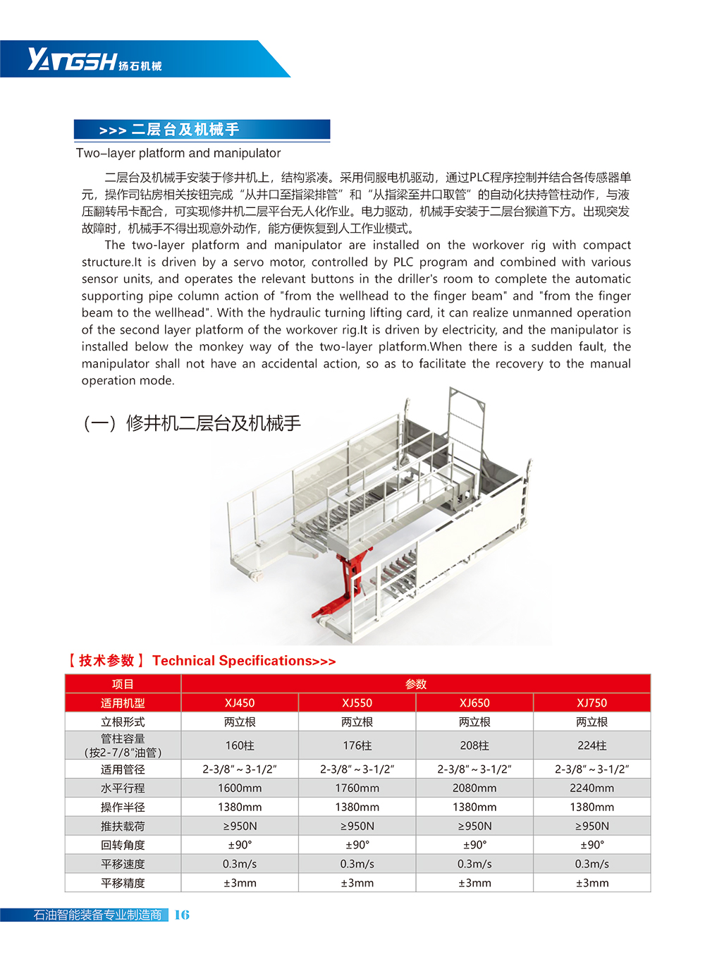 二层台及机械手安装于修井机上,结构紧凑。采用伺服电机驱动,通过PLC程序控制并结合各传感器单元,操作司钻房相关按钮完成“从井口至指梁排管”和“从指梁至井口取管”的自动化扶持管柱动作,与液压翻转吊卡配合,可实现修井机二层平台无人化作业。电力驱动,机械手安装于二层台猴道下方。出现突发故障时,机械手不得出现意外动作,能方便恢复到人工作业模式。