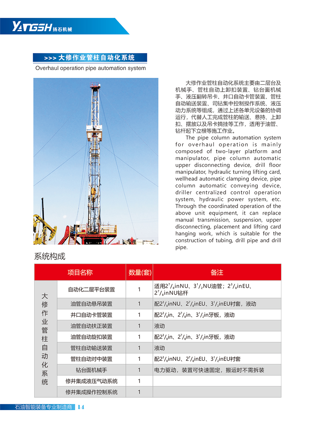 大修作业管柱自动化系统主要由二层台及机械手、管柱自动上卸扣装置、钻台面机械手、液压翻转吊卡、井口自动卡管装置、管柱自动输送装置、司钻集中控制操作系统、液压动力系统等组成,通过上述各单元设备的协调运行,代替人工完成管柱的输送、悬持、上卸扣、摆放以及吊卡摘挂等工作,适用于油管、钻杆起下立根等施工作业。