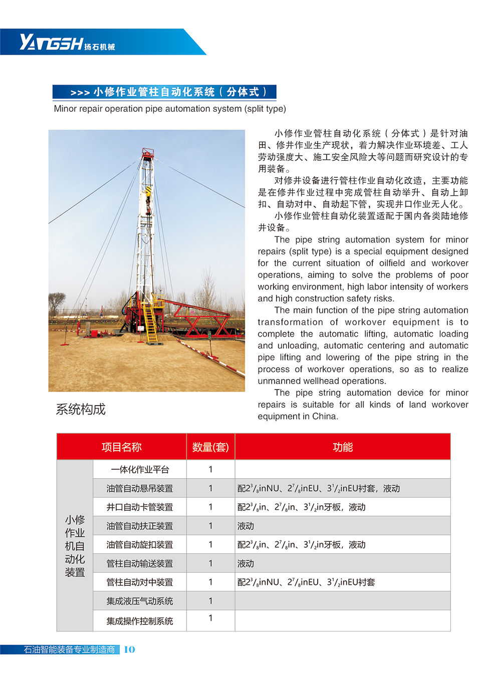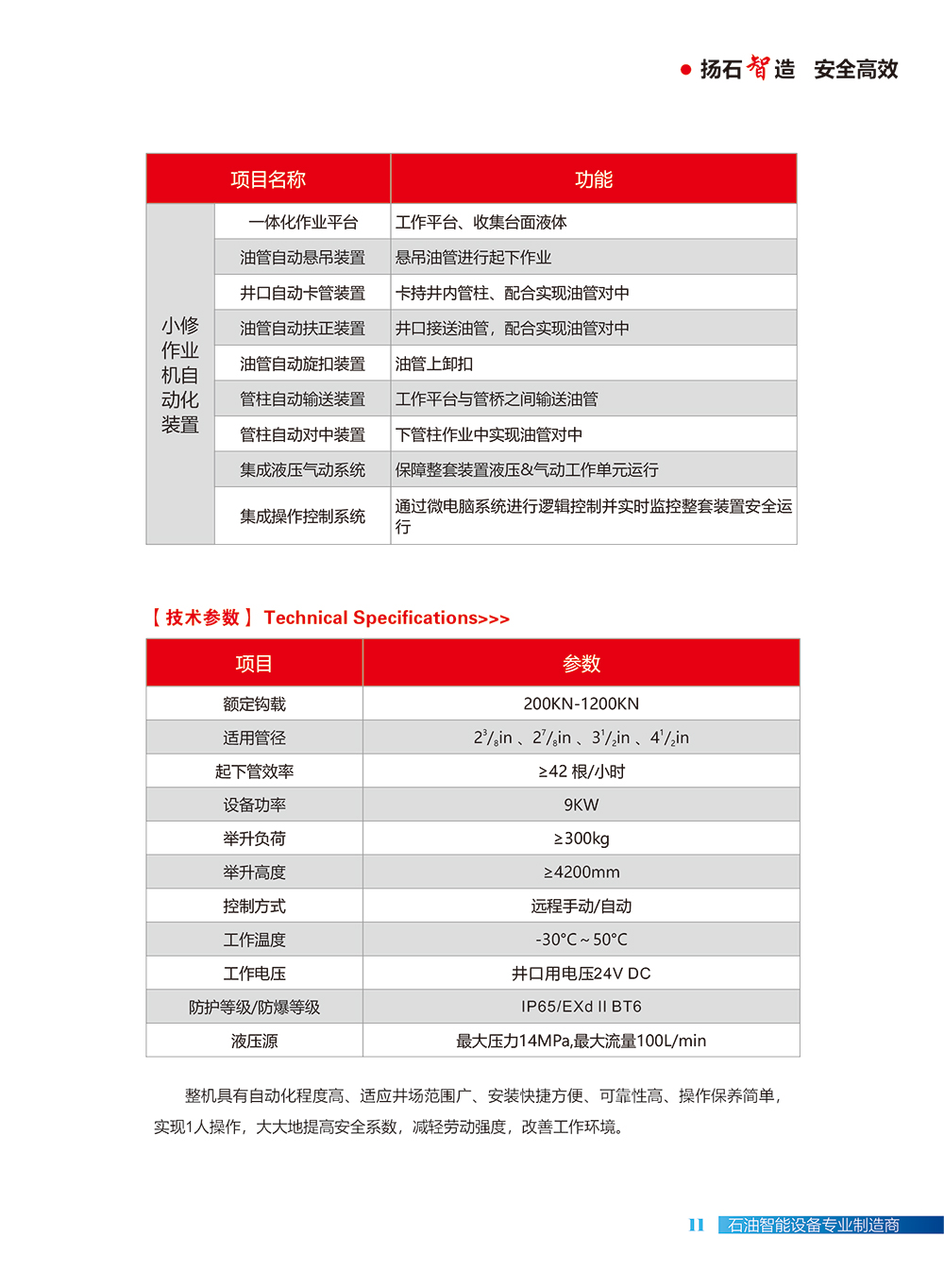 对修井设备进行管柱作业自动化改造,主要功能是在修井作业过程中完成管柱自动举升、自动上卸扣、自动对中、自动起下管,实现并口作业无人化。小修作业管柱自动化装置适配于国内各类陆地修井设备。